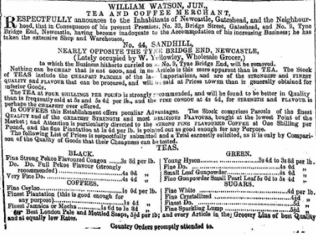 WILLIAM WATSON, JUN., TEA AND COFFEE DEALER, RETURNS his sincere thanks to his Friends and the Public generally for the large Share of Patronage conferred upon him, and respectfully announces that having completed extensive Alterations for the accommodation of his numerous Customers, he has REMOVED the Business hitherto carried on at No. 44, Sandhill, to his Premises, NO. 32, BRIDGE STREET, GATESHEAD, Where his Retail Business will in future be conducted, and assures those who may favour him, that they may at all times rely upon having Goods supplied of the best value. |