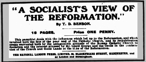 | 1903-04-18 | at the ILP conference: T.D. Benson made his debut as a speaker, and developed an unsuspected capacity for putting his case in clear, forcible language. He managed to enthuse the Conference over its financial position and the possibilities of the future. |