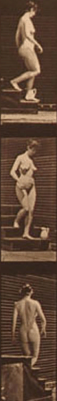 This animation of Muybridge's Plate 17 (from Animal Locomotion, published in 1887), Woman walking, must be one of the first movies showing a woman. The model for Plate 17 was Lily ____; other women Muybridge filmed included Mamie ____, Nellie ____, and Mrs Tadd. [Herbert, ed.] It's not yet clear who was first before the cameras, but numerically the first images included in Animal Locomotion of a woman moving in time are on his Plate 13, of which the 2D collotype is reproduced here, and my own animation immediately below (at 4fps).