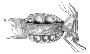 BitemarksAlthough it's been said that William I, king of England, would sometimes seal official documents by biting into the wax seals, only one instance of this is cited, and the document concerned—a title deed from 1069 CE—no longer exists. More credible is the example illustrated, which dates from the reign of Edward II (1284–1327). It's the impression in teeth on wax, in lieu of a seal, of Agnes, daughter of Agnes, daughter of Willim Fiz of Fyneham, on a deed in the muniment room of Sir Thomas Hare, as engraved and published in 1847. [Bitemark Evidence]