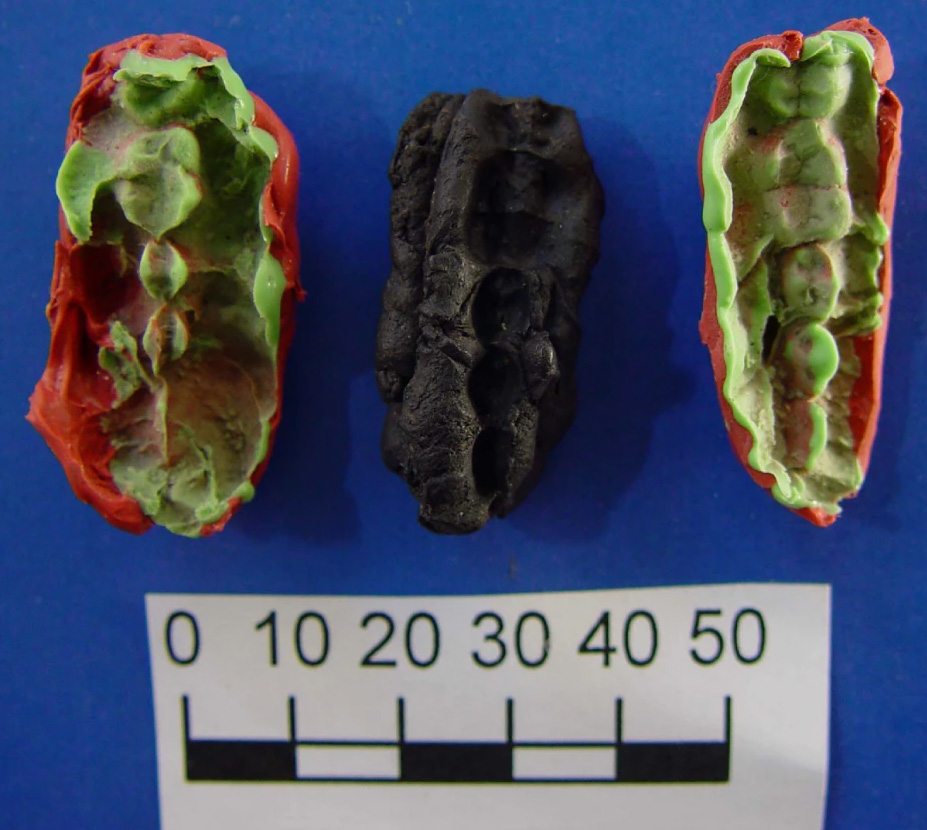 Much more ancient, however, are the teeth impressions from chewed birch pitch, found at Kuseby Klev, in western Sweden. These date from 9880–9540 BP. The image below is of one of the chewed mastics (in black) with a plastelina cast taken from each side. [Kashuba et al, Nature]